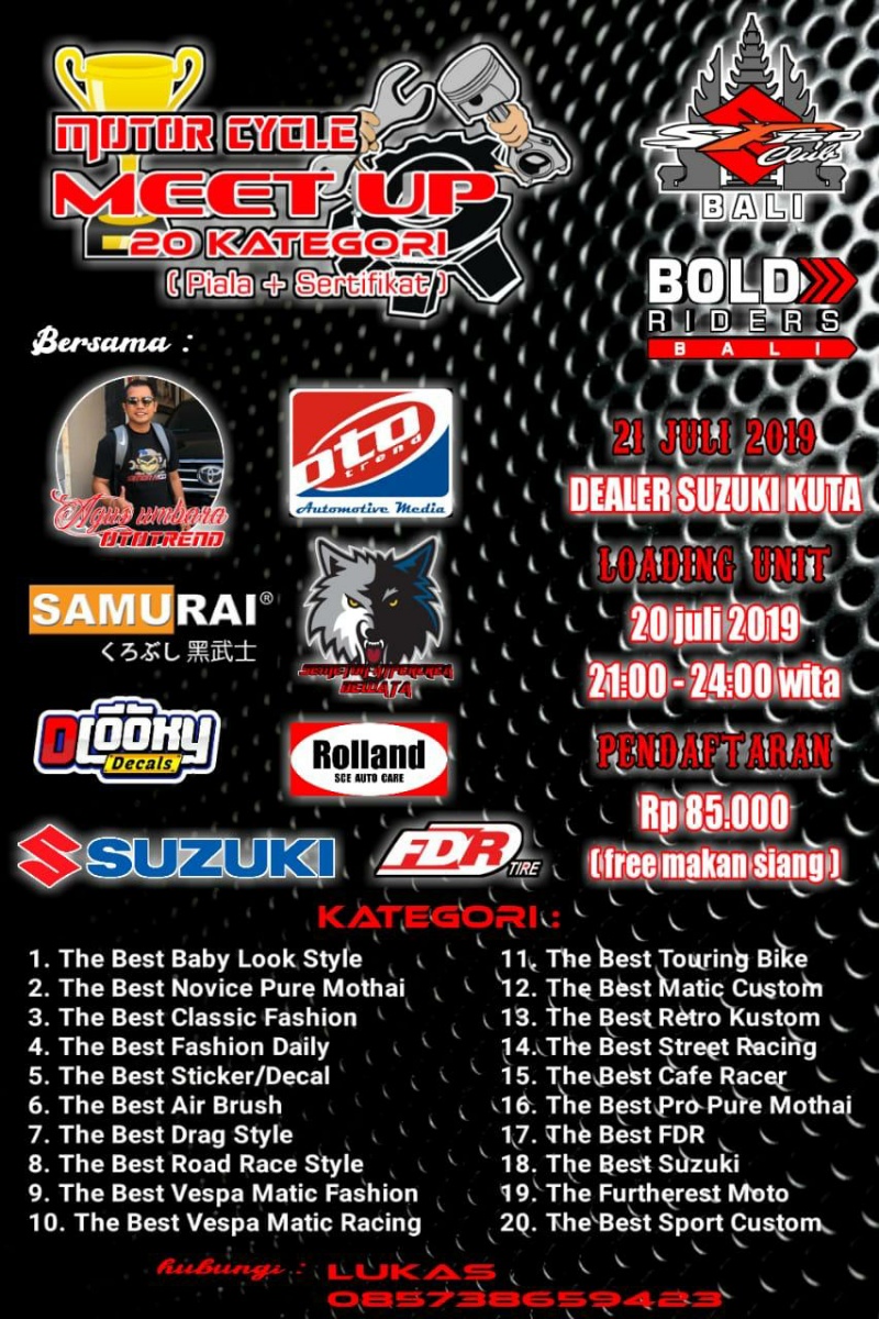 Untuk kelas racing / street racing / custom : tidak dibatasi kapasitas cc / jenis mesin. Kecepatan dan kekuatan mesin (power output) tidak dihitung, hanya mengutamakan showbike only, performa luar sebagai penilaian utama. Nosin dan noka tidak boleh diganti (harus sesuai STNK).