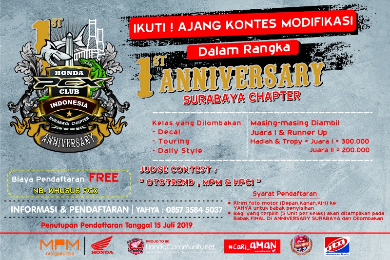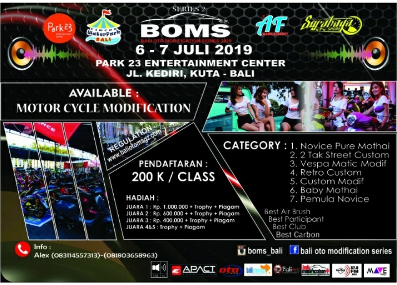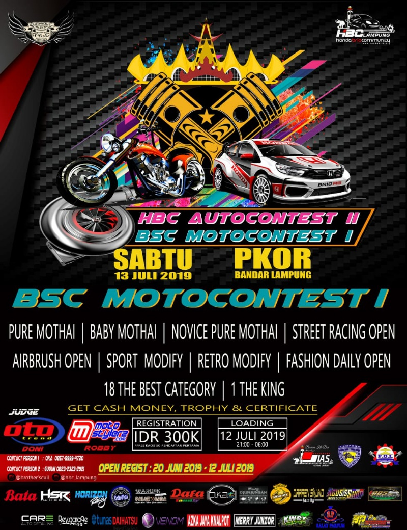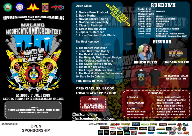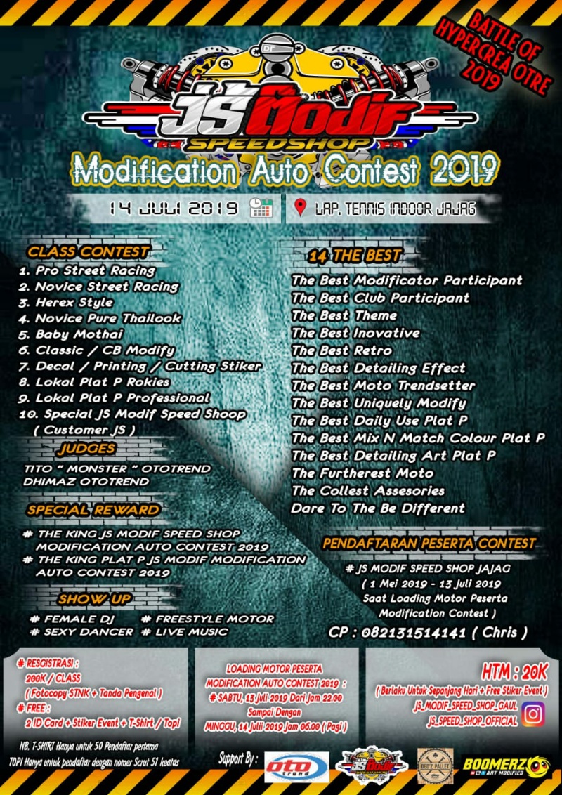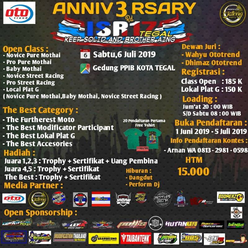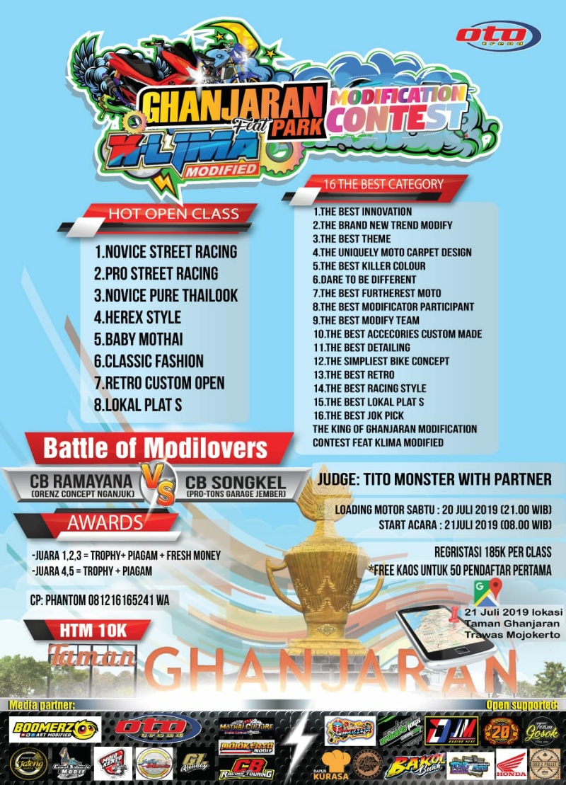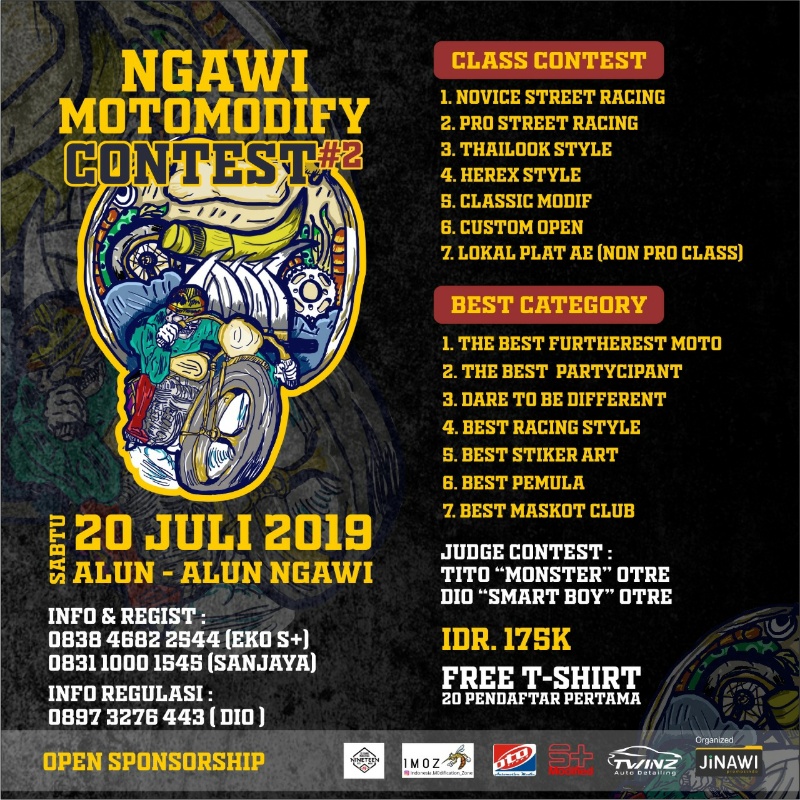 Spesifikasi modif “safety riding”, wajib pasang 2 spion, boleh aseso / standart motor. Wajib pasang platnom standar kepolisian (bukan buatan sendiri). Semua motor wajib layak jalan & fungsional.