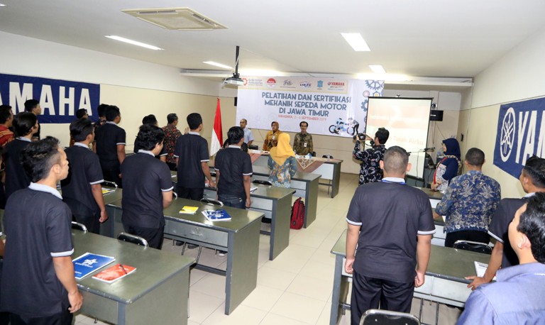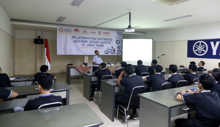 Pelatihan dan Sertifikasi SDM Mekanik Sepeda Motor berbasis SKKNI kali ini, digelar di Yamaha Training Center, Surabaya (3/9/2019), murni sebagai upaya peningkatan kompetensi sumber daya manusia (SDM) Industri dalam wujud sistem 3 in 1 yaitu pelatihan, sertifikasi kompetensi dan penempatan kerja dalam rangka untuk peningkatan kualitas dan daya saing serta kesejahteraan tenaga kerja industri.