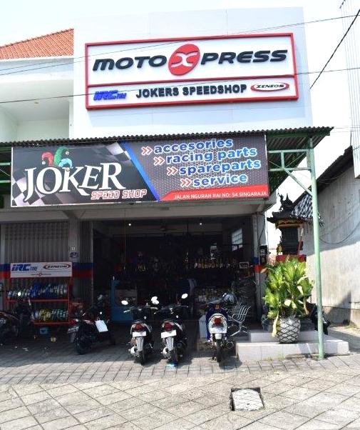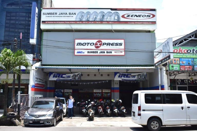 Ciri khas outlet Motoxpress. Ada logo besar Motoxpress warna hitam, logo IRC - Zeneos & dominan warna silver.