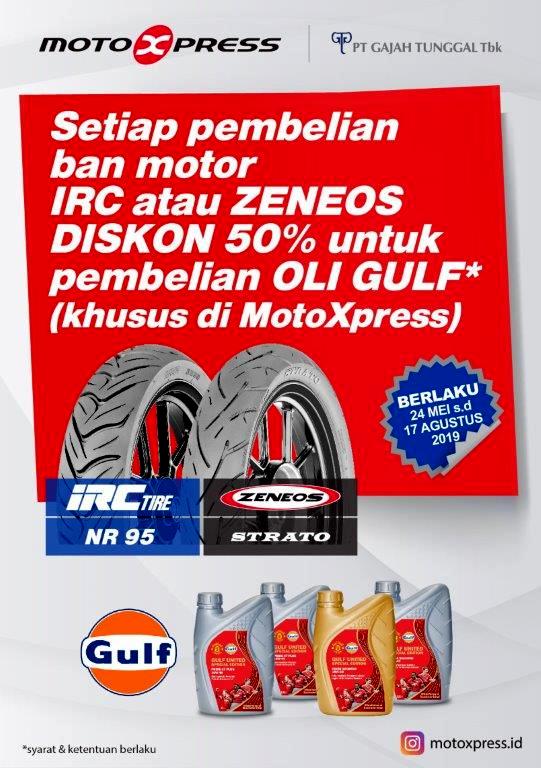 Kabar gembiranya, selama periode 24 Mei hingga 17 Agustus 2019, pengendara motor yang melakukan penggantian ban IRC atau Zeneos di MotoXpress, akan mendapatkan voucher potongan diskon 50% setiap pembelian oli mesin merek Gulf.