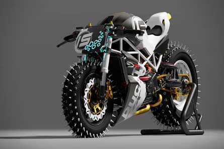 Kali ini, Paolo telah memutuskan untuk mengembangkan batas-batas desain dari 'Monster of Ice'. Meski masih sebatas sebuah konsep, desainnya Nampak mengubah roda belakang untuk jauh lebih besar, dan dipasang ban salju untuk tambahan traksi. Hasil akhirnya menjadi bertenaga Testastretta, motor salju ini siap memproduksi 160 tenaga kuda. | neo