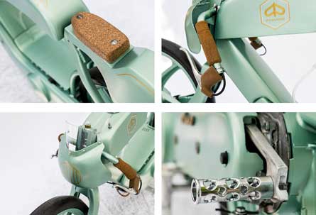 Dibikin ringan dan rendah, mesin dan drive train yang bersih tertutup menjadi satu itu dijadikan modal tampilan ringkasnya. Jok aslinya dilepas dan ditambahkan rangka tubular disisi belakang sebagai penyanggah jok dan bodi ala café racer tempo dulu. Tangki ditambahkan melintang ditengah rangka, desainnya ramping dengan pengerjaan yang rapi.