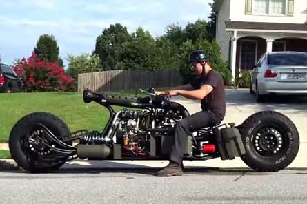 Dengan panjang (11'3 ") Sam mesti membangun pula sistem untuk motor agar bisa berputar. Triknya dipakai dua kabel push-pull yang terhubung ke poros depan dan belakang sepeda di mana pivot poin untuk setang berada. Sekali tarik berlawanan arah, roda depan belakang bisa bergerak secara independen. | Neo | Foto&sumber: net