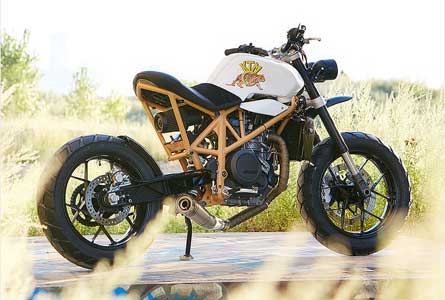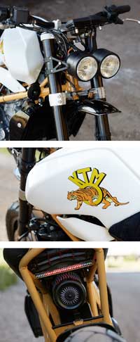 Muller bersaudara mengeliminasi bodi plastic, subframe, dan segala hal yang tidak penting. System air intake diinstal filter K&N besar untuk meningkatkan aliran udara masuk, dan ‘Smart Moto’ SAS valve plate kit untuk meningkatkan aliran gas buang. Tangki KTM tetap dipertahankan namun tanpa shroud. Bagian belakang subframe dan jok dibikin custom, didesain pendek dengan lapisan jok yang rapi dicampur kulit dan suede. Di bawahnya tersembunyi baterai lithium-ion tipis dari Antigravity.