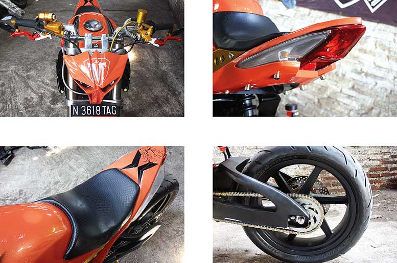 Pastinya, finishing warna oren dikombo pernak-pernik sport custom macam undercowl, knalpot kolong hingga disc-brake diameter besar, memastikan tampang juga kian gagah. "Pastinya, kalau lagi ngumpul sama komunitasku tidak malu lagi meski motorku tidak mewah, "ucap Rofiq yang mengandalkan knalpot Nobi sebagai penerus tendangan mesin Verza-nya. | Frans