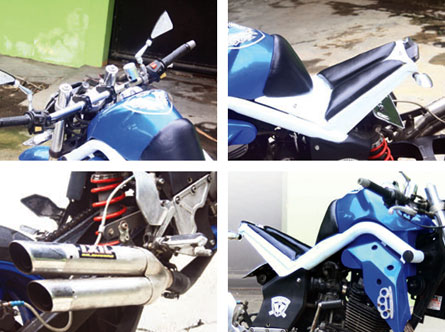 CAT/CLEAR : Sikkens, PELEK : Hayabusa, Ban : Pirelli Diablo 120/70-17 & 190/50-17, HEADLAMP : Honda Kharisma, STOP LAMP : LED, Setang : MFPS, SOK DPN : Honda CB400, MONOSOK : Suzuki GSX 750, Swing arm : Yamaha R1, Knalpot : Custom, MODIFIKATOR : X-K Bike Design, Jl. Pasir Muncang No. 46, Purwokerto - 0816692964.