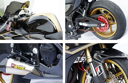 PELEK : Kawasaki ZX6, BAN : Brigestone 120/60-17 & 190/55-17, SOK DPN : Suzuki GSX 600, SOK BLK : Yamaha R6, SWING ARM : Yamaha R6, FOOTSTEP : Katsumoto, KNALPOT : Avionic, MODIFIKATOR : Benny, Jl. Mawar, Mersi, Purwokerto.