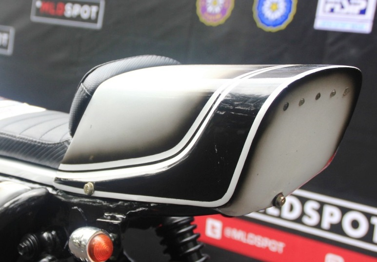 Biar tampilannya fresh, finishing mengandalkan warna putih berkombo pinstrip black colour bareng ritual Blinken yang lantas didukung setingan stang fatbar eks Byson beramunisi spion variasi serta kedok lampu flat track style.