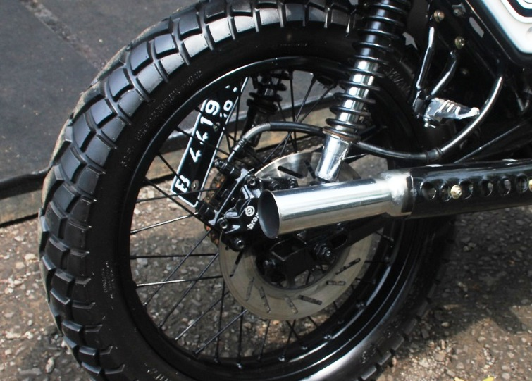 Lebih spesifik, roda-roda disetin macho lewat pelumat aspal semi pacul Swallow disetiap lingkar pelek almu blacknya. “Makin garang, custom engine guard ikut dipamerkan, kelar menambahkan double ciet, sekaligus custom muffler yang ready nge blar dibejek malming,”canda Risna.