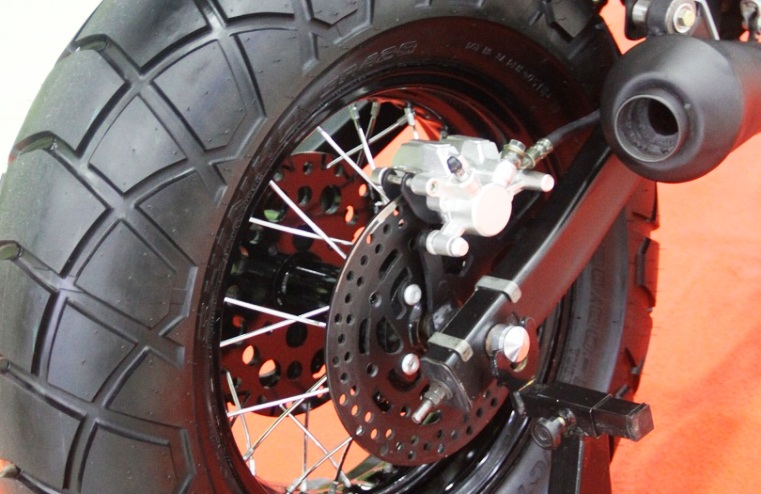 Kali ini sepasang kaki-kaki rujukan Yamaha TW200 build up, doi instal bareng pelek buritan kustom 14” dan depan almu 18” spoky. Keduanya spontan dikekang set karet penggilas aspal berlabel Shinko enduro SR428 Series komposisi depan 130/80-18 dan 180/80-14. “Karenanya musti kukustom ulang swing armnya melebar.