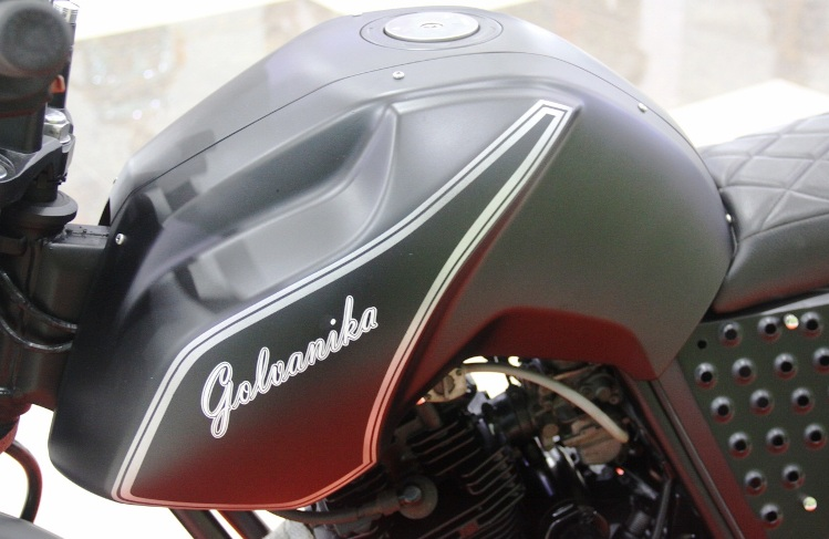 Sementara itu untuk depan, set fork Byson kucangkok biar gagahnya seimbang,” lugas pemancang exhaust kustom ini. Pamungkas aksi, body styling diolah simple macho bareng asupan fuel tank Byson berseater cepak yang buritannya ditancapi stop lamp Grand sabit. Menyempurnakannya, all performanya dilebur kelir hitam flat berstriping simple bertuliskan Golvanika.
