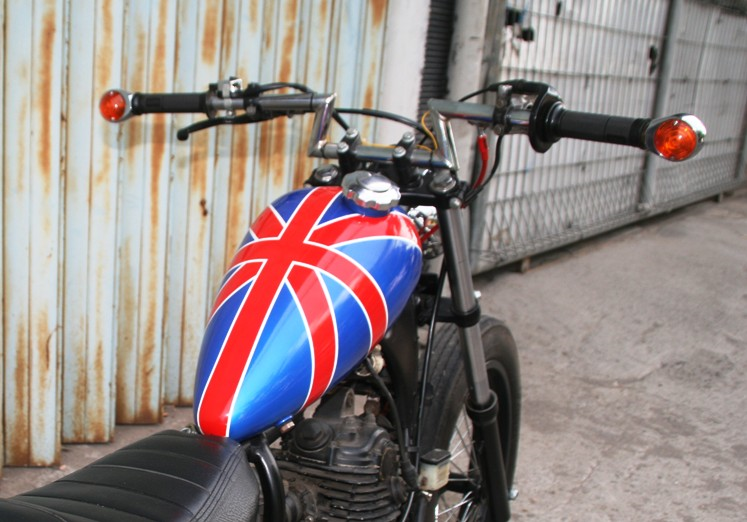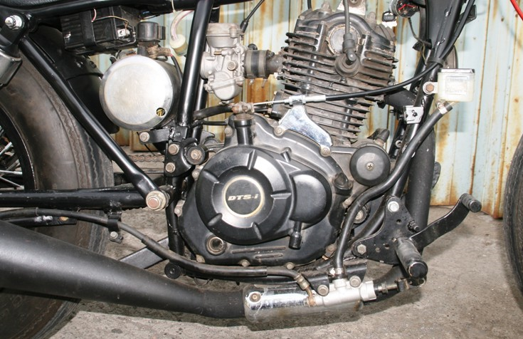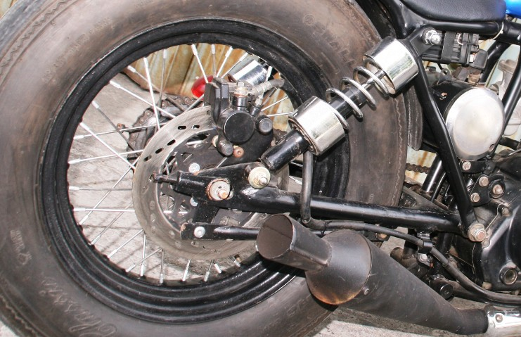 Kemudian, dikawinkan sok teleskopik KLX 150 dan tapak kaki ring 18, untuk mengejar sudut rake lebih lebar. Termasuk subframe buritan, didesain landai hingga dekat dengan tapak kaki belakang. Sipnya, lengan ayun custom model tubular, guna memperkental kesan retro.