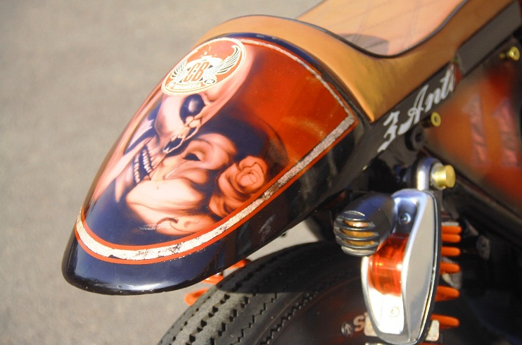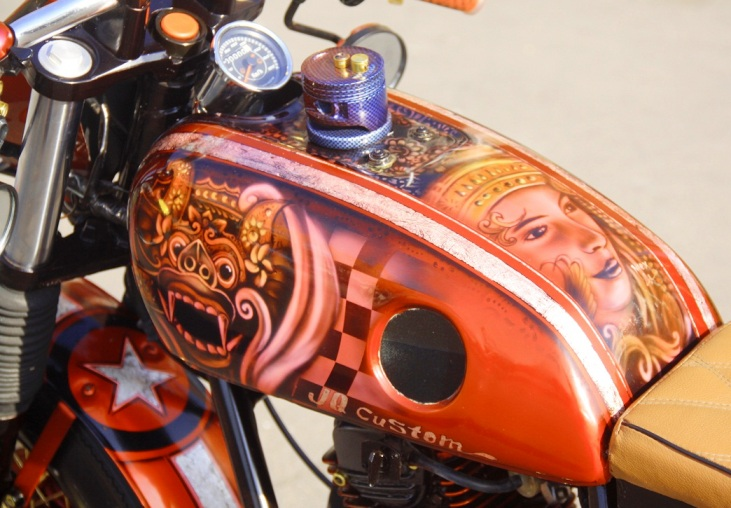 Kelar merangkai rangka dan kaki-kaki, body styling didesain anyar bergaya cafe racer kental bareng aplikasi empang bensin kustom CB berlubang aquarium, tail body hornet, serta mini fairing depan berhead lamp triangle style. “Sempurnakan master piece kustomku, all body anyarnya kubalut airbrush realis bertema Balinese Kultur,” bangga Rio.