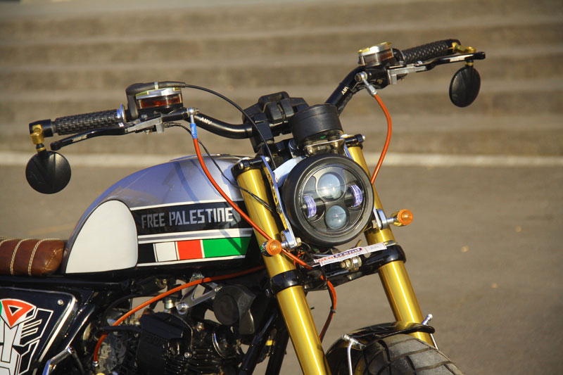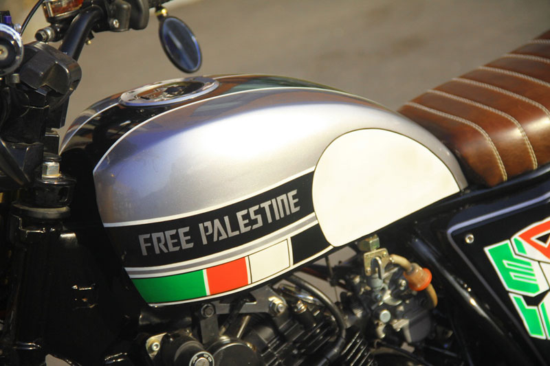 “Kelar memasang set fender simply drag style, saatnya kugencarkan aksi simpatik dengan mentattoo dinding empang bensinku bertulis Free Palestine,” pungkas pemasang setang baplang fat bar bersanding head lamp Daymaker ini. tito