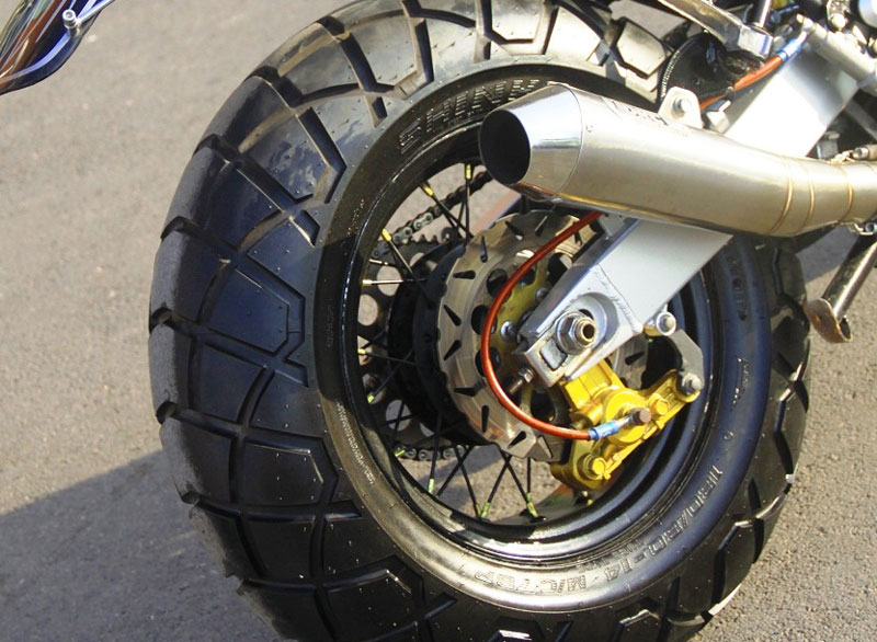 Dikreasi bareng DCT Custom Bike, kaki-kaki jadi jujukan awal aksi kustomisasinya. Sepasang karet ban kembang enduro profil donat TW200 dipinang dan diinstal gagah bareng set fork up side down serta swing arm kekar eks. moge. “Siap kukombain set undercarriage TW200 yang body designnya kuolah bergaya scrambler style,” ungkap warga Langgen Talang, Tegal.