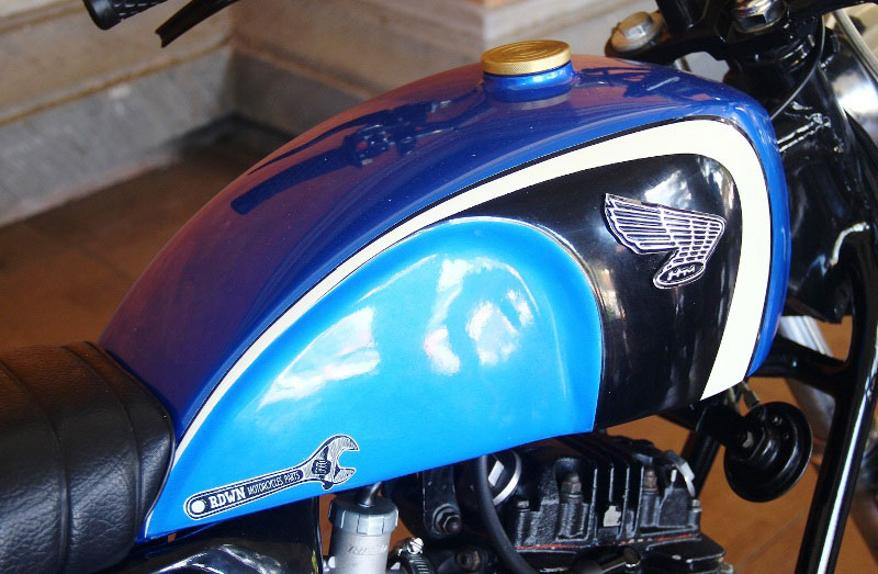 Menyupport gaharnya lingkar kaki, Boby mengisntal fork jarahan Byson yang diimbangi pembuatan swing arm berpenampang tubular kustom berperedam pilar sok aftermarket tabung. Menyempurnakan obsesinya, body work didesain berplat galvanis, meliputi kolam bensin klasik fat bob Triumph style, side cover serta pasangan fender klasik berframe besi tubular.tito
