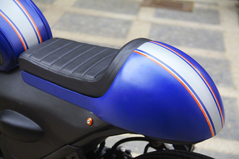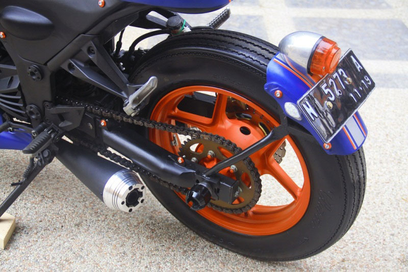 “Berbekal adonan serat fiberglass, desain tail body-nya kuolah bergaya hornet style, menyambung empang bensin rounded Bonneville style yang juga kubuat dari bahan dasar fiberglass,” ungkap Arno yang juga mendesain side cover berbahan fiber.