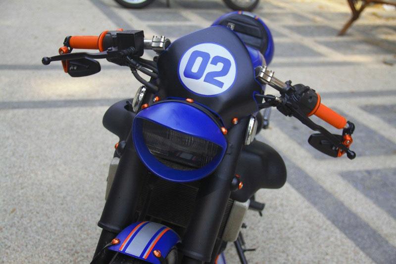 Lanjutkan aksi, area muka dipolah artistik dengan kondomisasi head lamp membentuk konsep oval techno look bersanding pasangan kondom inner tube fork yang sukses merilis bentukan retro techno.