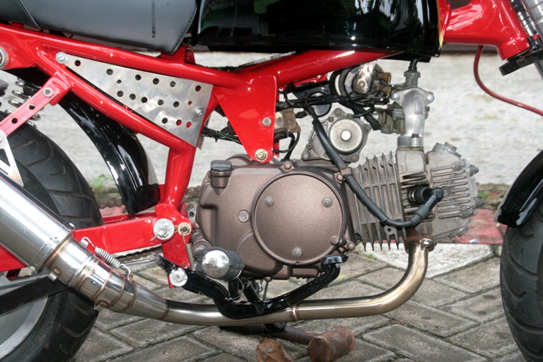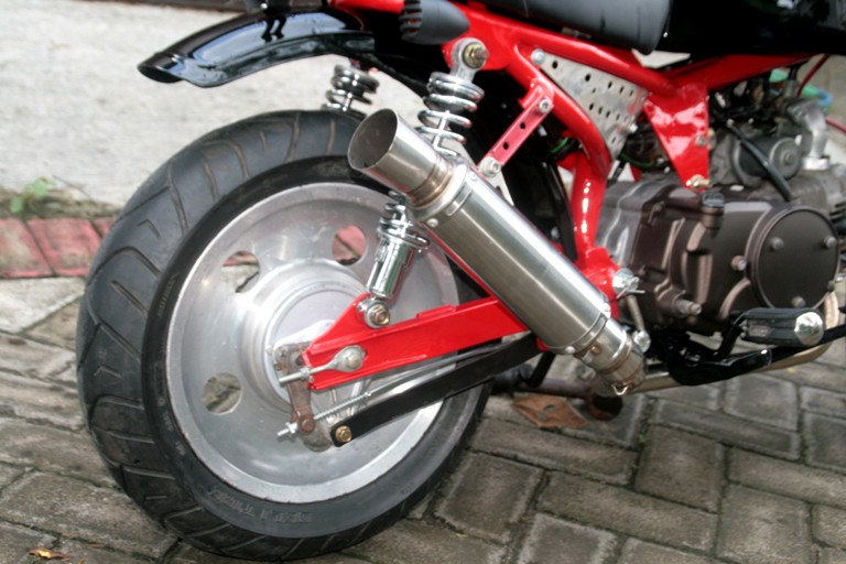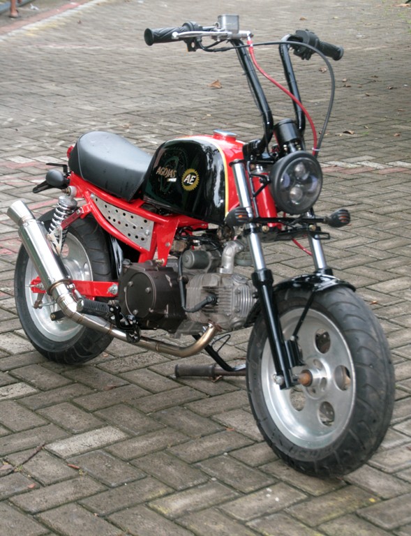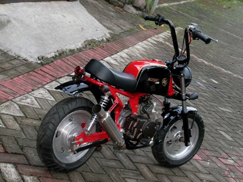 Tema modifikasi Mini Bike tipe dewasa kali ini merujuk pada konsep Monkey Tracker. Ciri khasnya ada di tapak kaki gambot, hasil pemakaian velg custom jenis monoblock profil 185-12 dan 215-12, dililit Ban IRC 120/70-12 depan belakang.