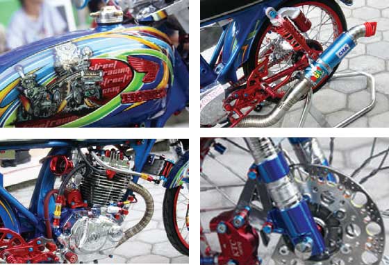 DISC : KTC, MASTER-KALIPER : KTC, SWING ARM : B-Pro, SOK BLK : Racing Boy, PELEK : Takegawa, BAN : Duro, KARBU : keihin Sudco, KOPLING L Hidrolis KTC, OIL COOLER : SPS, KNALPOT : CHA, HEAD LAMP : Pro J, FOOT REST : Fast Bike, SETANG : RC3, STABILISER : MSX, FILTER : Stag, GAS SPONTAN : Willwood, SPION : Posh, TACHO : AX Case, MODIFIKATOR ; Alos Motor Besuki-Situbondo (082232805343)