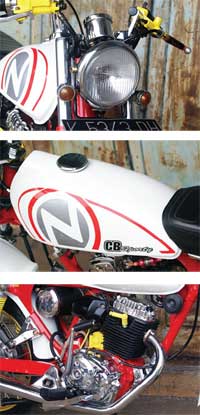 “Gaya klasiknya ini aku pengen yang cerah dan ngeblink tentunya skema harian,” ujar pria yang bekerjaan sebagai Dept kolektor ini. Untuk mendapati bentuk klasiknya ini doi mengganti tangki dari DT 125, spatbor belakang CB dan tempat aki tengah dari filter Suzuki A100. Ditambah lagi segi penerangnya, Nippon mengusung headlamp variasi HD serta dibelakang disorot stoplamp BSA.