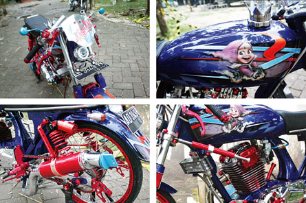 SOK BLKNG : Answer, CAKRAM/KALIPER : Brembo, LAMPU DPN : Proji, KNALPOT : CHA, CAT/CLEAR : bLinken, MODIFIKATOR : Restu Ibu Modified, Solo.