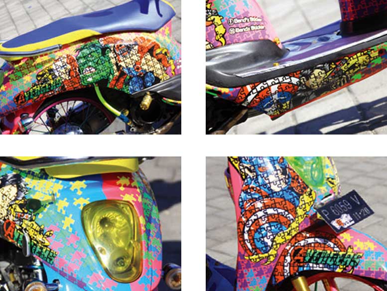 Kesemuanya menghiasi beberapa sisi body, dari dada, lambung kanan-kiri serta under cowl Scoopy berkaki belang Thai trend style ini. Lantas sebelum direkatkan, hasil olahan desain cutting sticker 3D ini dipecah-pecah bareng motif khas puzzle. kelar direkatkan, potongan-potongan puzzle Avangers ini dileburkan dengan serpihan puzzle warna-warni demi mendongkrak aksen indah kompisisi warna serta totalitasnya.