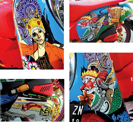 MELIHAT BEJEKAN milik M. Miftahul Qirom, makin menunjukkan Banyuwangi adalah sentra seni cutting sticker. Tampak jelas dari jubah plastik skutik rakitan ’14 miliknya, kombinasi warna dasar merah dan birunya mengusung teknik wrapping untuk membungkus rapi kesuluruhan bodynya.