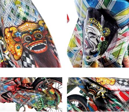 “Untuk basis konsepnya kuunggah style airbrush grafis dengan menekankan teknik level tinggi, dimana base coatnya kupakai serbuk gliter,” tegas warga Jl. Pidada 10, Ubung, Denpasar- Bali ini.