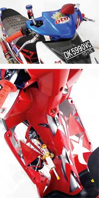 NGO style spontan doi angkat, meng kolaborasi finishing berkelir putih, merah dan biru khas gajah putih. Sebelumnya, trondolisasi doi gencarkan dengan menggudangkan set side cover, set fender, boks filter karbu serba under cowlnya. “Aku juga mencoak area back deck dan under seat covernya bermotif tribal, yang lantas kubalut warna kontras merah doff,” tunjuk Budiartana yang mewarna main bodynya putih resik.