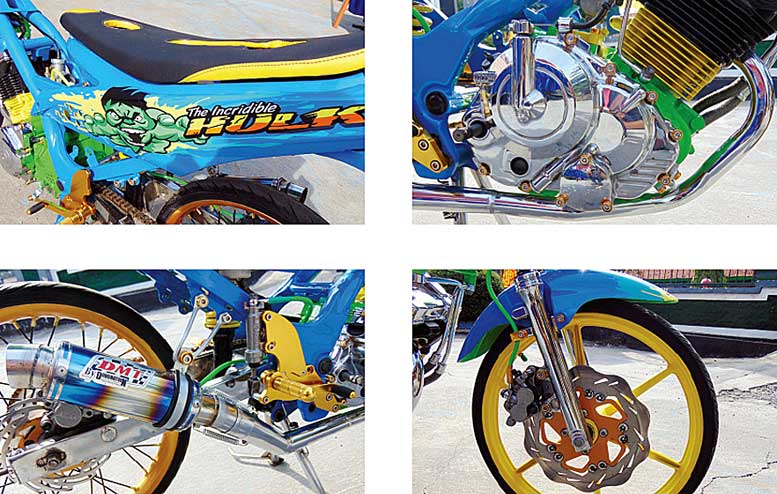 Untuk pelek, doi adopsi gaya belang style dengan menjarah lingkar depan milik Sprint almu palang serta buritan milik Comet almu spoky. Penutup aksi modifnya, doi membalut bodi dengan cutting stiker bergambarkan The Incridible Hulk. | dio