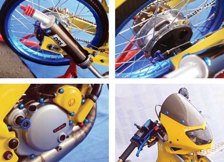 CAKRAM: Braketech, KALIPER: Ride-It, TROMOL: MP&MX, PELEK: V Rossi 140x17&160x17, BAN: FDR Drax 50/90x17, KEDOK Honda LS 125, KNALPOT: DBS Stainles Thailand, LAMPU DPN: Honda LS 125, FOOTSTEP: B-Pro, STANG: B-Pro, STABILISER: Scarlet Racing 24 click, GAS: Posh, CAT: Blinken, BRUSHER: Gang Be, MODFIKATOR: DNS Kebonsari 081233773661/081913912131