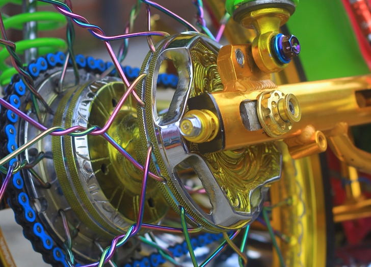 Lebih spesifik, roda-roda juga diseting lebih lincah, lewat aplikasi pelek almu ban ban cepak 17 incian. "Saya juga pasang tromol custom, cakram, grafiran dan ruji plintir, komplit! " tambahnya.