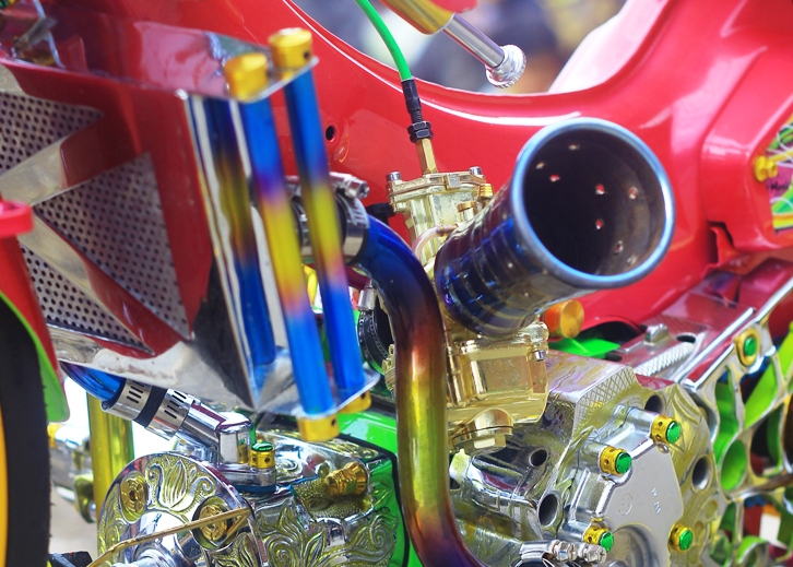 Engine? Jangan tanya, oprekan khas 2 tak Yamaha digarapnya, dengan menjejalkan blok head FIZ-R, berikut komponen pendukung macam as kruk, rasio, dan kopling house, plus knalpot custom udang serong kiri.