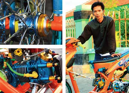 YOGA PUTRA emang kesemsem haluan street racing, bahkan merelakan Mio ber-STNK 2009 sebagai alat pelampiasannya. “Wah, saat melirik motor display alias kontes pasti paling ramai di area aliran street racing. Di situ saya ingin mencoba dan memiliki kebanggan bisa tampil kekinian,” jelas warga Perumahan Taman Asri Pasuruan ini.