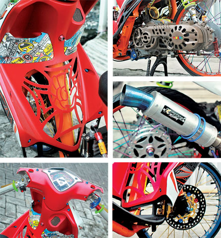 Belum dirasa maksi, Chebe sontak menabur beragam aseso khas racing gajah putih, dari area under carriage berkaki ceking, ber-CVT Nouvo Z bolong racing Thailand, bersuspensi genuine Thai, serta berknalpot free flow, hingga area setang yang kini ditampilkan merunduk cekak dan berujung tekuk.