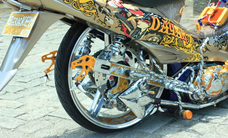 PELEK DPN & BLK : V-Ixion 2.50 & 3.50 X 17, SOK DPN & BLK : Seven Speed & BMX, CAKRAM DPN & BLK : PSM & V-Ixion, MASTER REM : KTC, KALIPER : NMax, SWING ARM : Supertrack, BAN : CST 60/80-17, OIL COOLER : Bungbon, KNALPOT : Custom, HEADLAMP : Projector, LAMPU SEIN : LED, FOOTSTEP BLK : Custom, STABILIZER : Ohlins, GAS SPONTAN : Scarlet, SPION : Custom, TACHOMETER : Koso, PERSENELING : Custom, CAT & CLEAR : Nippon & Titan Lux, TEMA : Dayak Culture, KROM : Star Chrome, MODIFIKATOR : Lause Nangte Garage, Jakarta (087777784831).