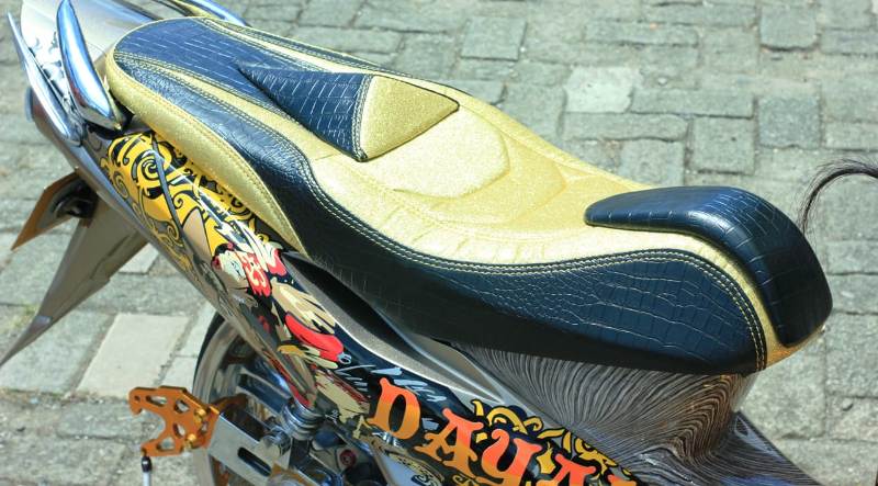 Demi memperpadat penampakan sektor undercarriage, terpancang dobel knalpot custom yang makin detail kala lingkar kakinya dieloki pemasangan caliper guard custom, braket foot rest boncenger berbahan besi kotak ulir serta terunik yakni pemasangan hand shift berbentuk pedang. “Biar makin estestik, baik caliper guard, maupun swing arm dan kalter enginnya kusentuh teknik grafir bermotif ukir floral,” tunjuknya seraya mecelup krom all area under carriagenya dengan dipercayakan kepada gerai Star Chrome.