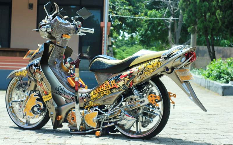 Roketkan lagi keunikanya, tema mocep Jupie Z ini diolah tradisional style ajib bareng unggahan tema Dayak Culture. Tak heran jika base coat anyar berkelir coklat bahan Nippon berclear pernis Titan Lux-nya kini disentuh estetik olahan cutting sticker tema Dayak.