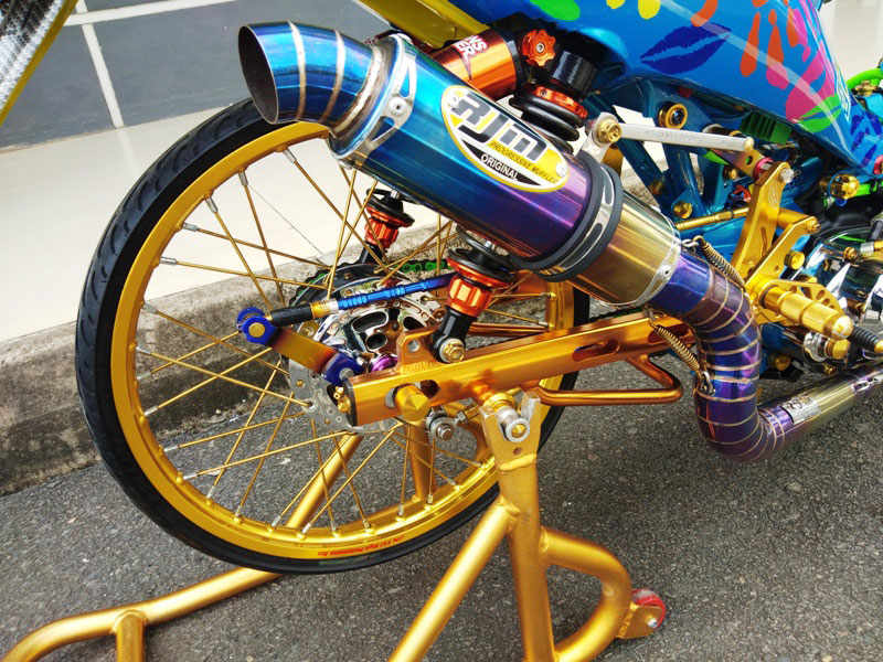 Di belakang, peredaman suspensi juga dimaksimalkan dengan dobel sok Answer untuk menggoyang swingarm gold dari B-Pro. "Sementara, roda belakang gak pake cakram, tapi saya pasang drum brake dengan tromol custom coak," ungkap pemakai knalpot variasi buatan RJM Performance, yang menggantikan knalpot custom kidal di variasi sebelumnya.