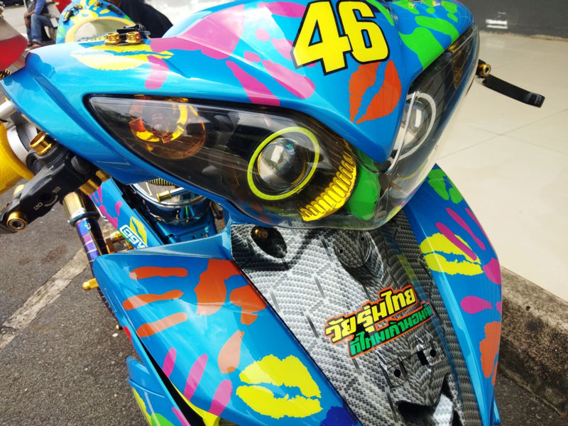 Wet looking yang terlihat nyata di bodi motor Yamaha keluaran 2004 ini, berkat hasil pengecatan polos dan airbrush dengan beberapa aksen water printing. Lebih unik, desainnya tidak melulu ditimpakan ke bodi utama, tetapi layaknya pop art. Oplosannya sendiri, berbasis cat Sikkens baik main-coat ataupun clear finishnya. "Meski dasaran biru, saya tambah motif unik seperti grafiti, bentuknya berupa cap tangan, cap jari dan cap bibir. Jadi terlihat unik kan?" ucap Bayu Gepeng, sapaan akrabnya.