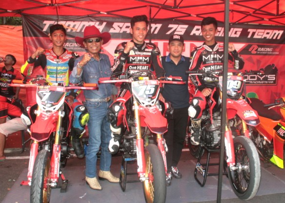 Tim MPM Honda TS75 RC3 GCX Kelambu Wuring, Jatim, bersama Bambang Haribowo Ketum Pemprov IMI Jatim & Mario. Bintangnya tim supermoto Jatim & dominasi podium kejuaraan di setiap even kejurprov road race Jatim.