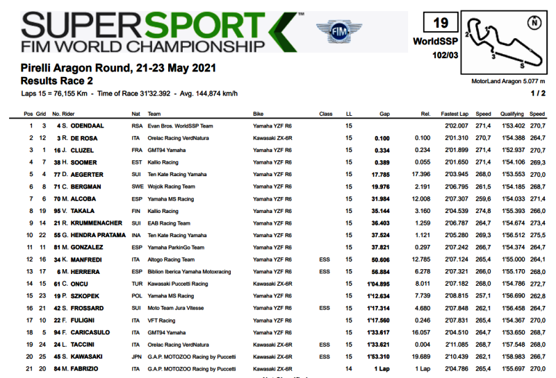 Race 2 WSS Aragon yang berlangsung 15 putaran ini dimenangi oleh Steven Odendaal dari Evan Bross Yamaha yang finish dengan gap mepet 0,1 detik dari Rafaela De Rosa dari Orelac Kawasaki. Sedangkan podium ketiga direbut Julez Clusel dari GMT94 Yamaha.