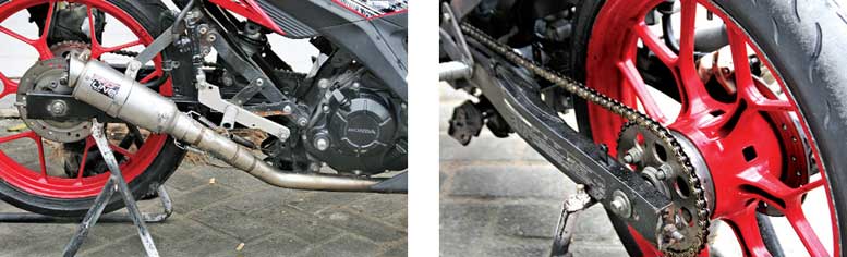 Dasar itu juga fly wheel diplot di 800 gram dan porting intake didesain guna maksimalkan flow gas segar. "Beda dengan lubang buang, yang diporting minimalis guna mempertahankan torsi di gasingan atas," urai Maxeon yang meneruskan pemakaian knalpot produk Pro Liner.