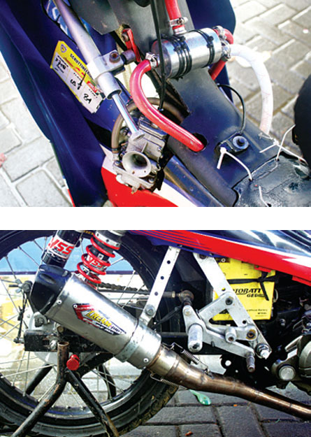 "Sebab, untuk mengumpan RPM saat kontrol torsi mesin lebih lebih mudah," yakin Riko. Sedang suplai gas segar, disempurnakan pemakaian katup 26 mm (in) dan 23 mm (ex), diback up pegas katup aftermarket custom Kucing.