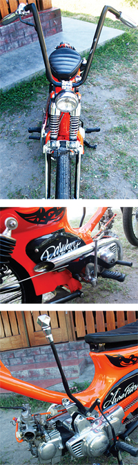 {jathumbnail off}Dan pengerjaan secara total pun doi tunjukkan pada hasil akhir dari ide-idenya tersebut. Diantaranya dengan hadirnya sok springer custom yang mengandalkan double sok belakang C70, untuk mengendalikan putaran tapak kaki yang menonjolkan keberadaan 72 jeruji yang tersusun dengan rapi. Begitu juga dengan stang khas choppy yang terkesan rapi lantaran konsep iner trottle yang dipilihnya.