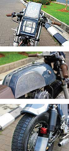 Di depan, nangkring empang bahan bakar made in sorangan yang nyetrik berlapis plat bertato grafir sebagai identitas retrois ditengah guyuran gray colour beradonan cat and clear Spieshecker. Selain diperkuat stang jepit semi merunduk dibarengi variasi handgrip, desain kedok lampunya ogah tampil monoton.