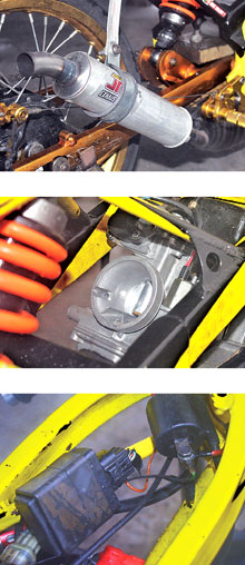 Dilepas knalpot JMF berdesain evolusi Python, dengan stinger lebih panjang di 32 cm dan perut ramping di 39 cm. Dilayani Keihin PWK Air Strike 38 mm Selenoid ex Honda CR 250, dengan selenoid yang dinonaktifkan. Diaplikasi lantaran sudut velocity depan lebih membuka, gasingan menengah atas udara masih bisa diusahakan maksimal.