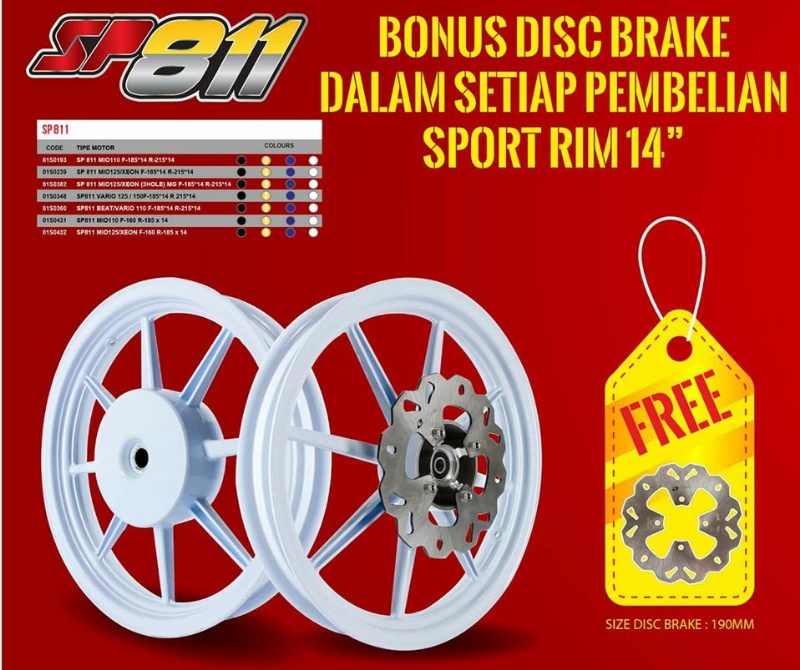 Well, bonusnya jelas spesial gaes. Setiap pembelian satu set velg atau sport rim 14 RCB type SP522 dan SP811, langsung mendapatkan disc brake size 190 mm gratis lho. Program bonus special dari RCB ini sengaja diberikan sebagai bentuk apresiasi dari manajeman marketing RCB. Setelah melihat semakin meningkatnya pasar aksesoris RCB di Indonesia.
